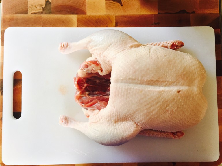 Rinse thoroughly with cold water. Put that duck on a plastic cutting board and get it out of the way.