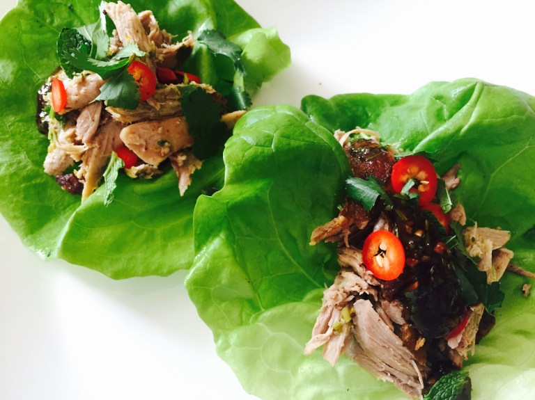 Wait for it to cool a little bit, and shred like a chicken. Make sure you get everything and peel off the skin, chop that up, and add to the shredded duck. Then just assemble your lettuce things.