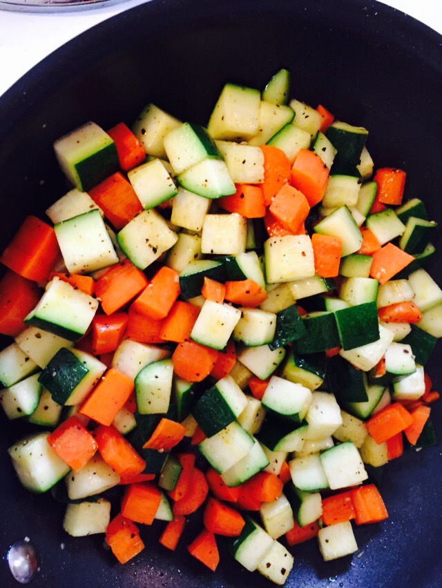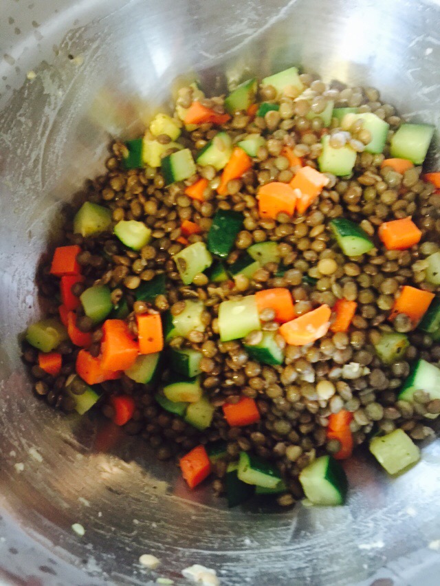 Add carrots and onion to oil in a hot pan, and season with salt and pepper. Cook until carrots start to become soft, add your zucchini and continue to cook for a few more minutes, until all is cooked to your liking. I kept a little texture in the carrots and zucchini. Add these vegetables to your lentils and toss.