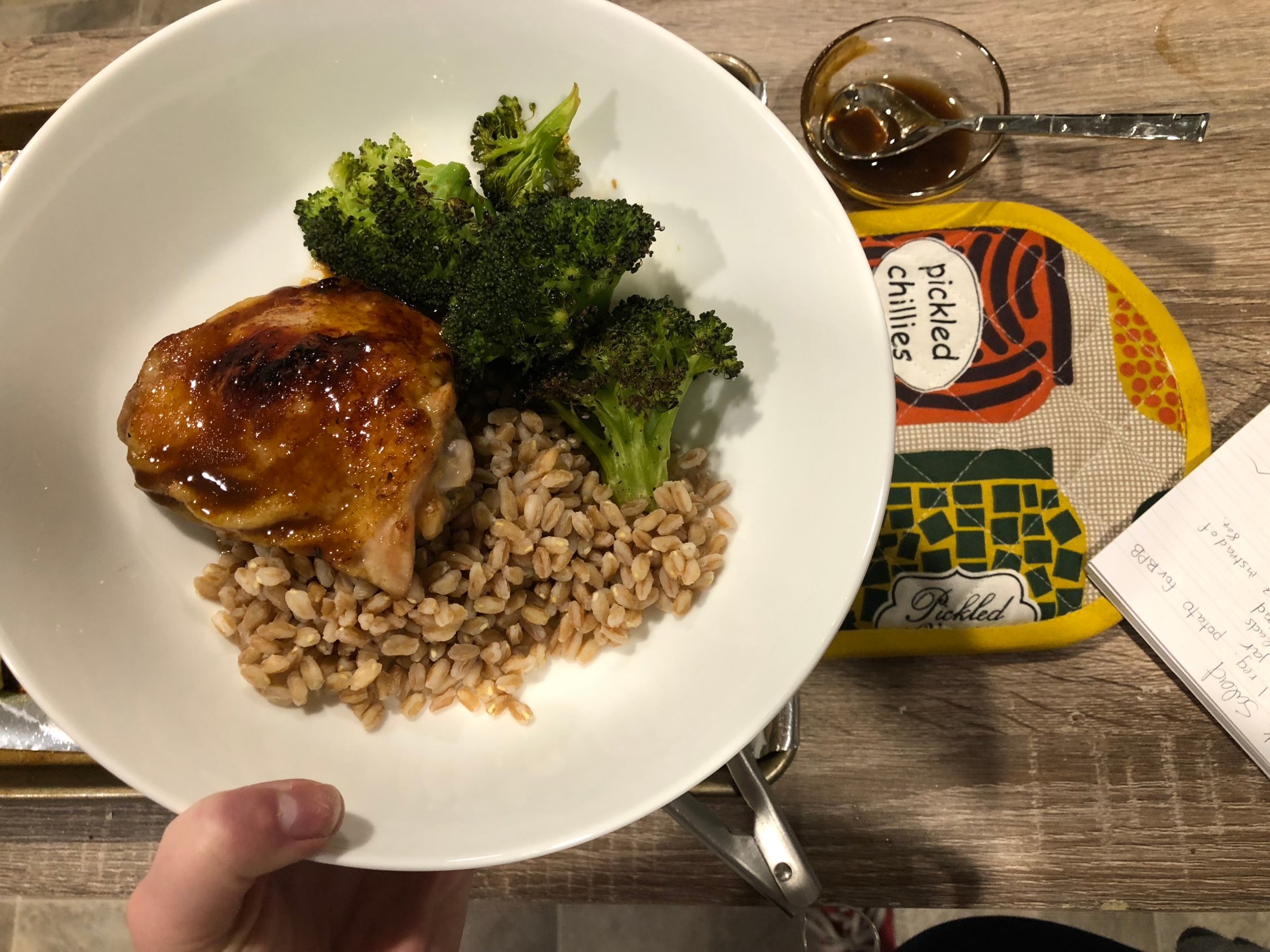 - 4 chicken legs, thigh, and drumstick together [My grocery store was out of leg quarters, so I just used thighs instead. 6 thighs because I have a small oven and could only fit 6, having room for broccoli as well]