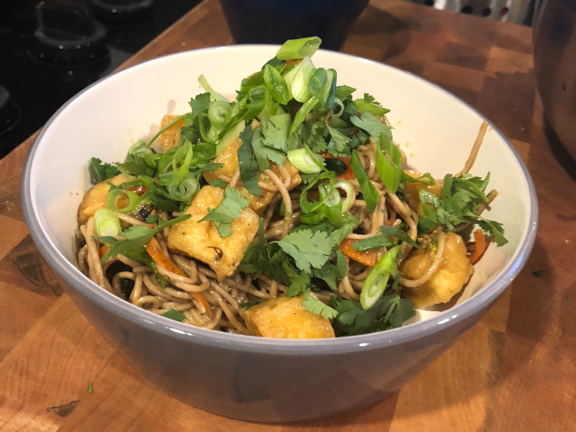 - Add tofu, vegetables, and soba to a bowl. Pour in the sauce and stir well. Put some in a bowl and top with the green onions and cilantro.