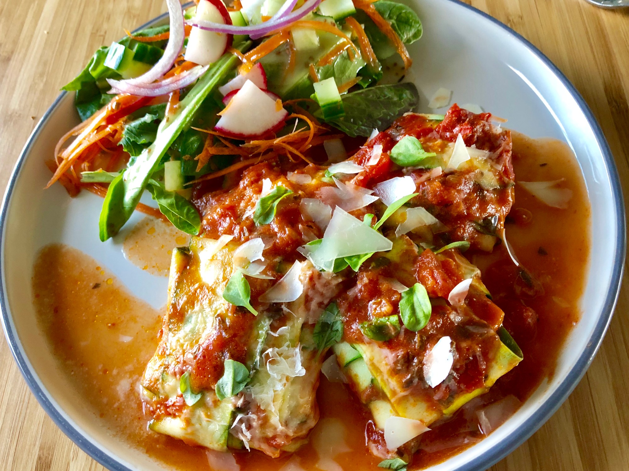 I saw this recipe on The Chew the other day. As an aging human, I sometimes feel the need to eat healthier. Which usually lasts for just that meal. This is a bit of a craft project of a meal. While it tasted good, it was a little too vegetable-y to be a pasta substitute. I keep trying vegetable pasta alternatives and it never seems to satiate my pasta appetite. Below is the recipe from The Chew and in [italiciced bold will be my changes or suggestions].